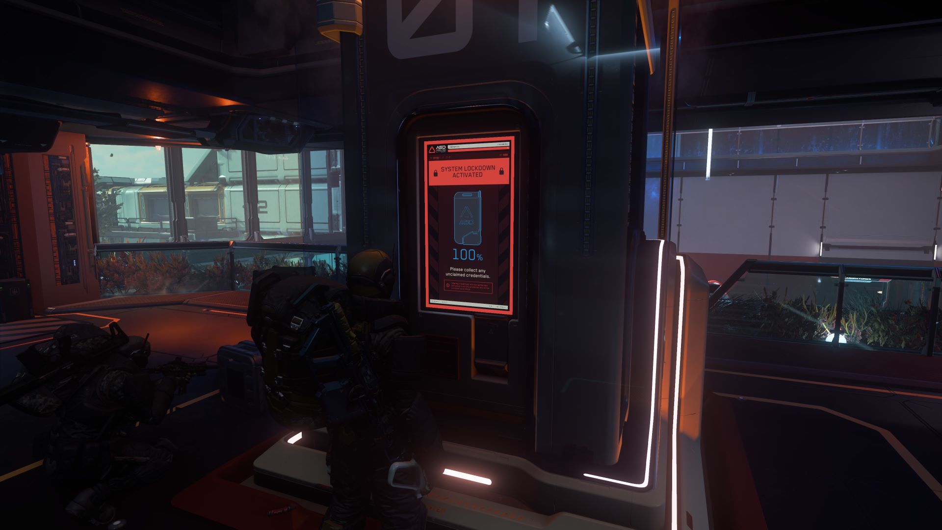 Schlagartig war es still. Der Alarm verstummte und die Türen gingen zu. Auf dem Display des Hauptterminals stand schwarz auf rot ‘SYSTEM LOCKDOWN ACTIVATED’, darunter schaute eine bläulich leuchtende Karte heraus. Langsam ging ich mit rasendem Herz darauf zu und nahm sie in die Hand.