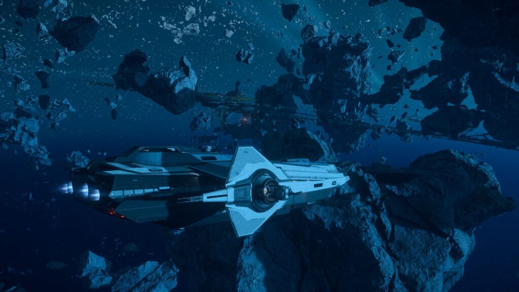 Leise schwebte ich durch das bläuliche Schimmern des Asteroidengürtels auf eine abgerissene Cockpit-Sektion zu. Für die atemberaubende Aussicht hatte ich keinen Blick. Ich zog meine Waffe, wagte einen Blick in das Cockpit – leer.
