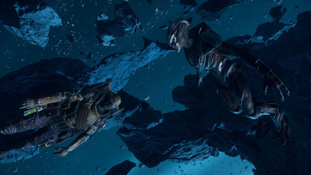 Mein Griff um die Waffe wurde fester. In der Ferne, gegen das Licht, eine schemenhafte Gestalt. Lang, groß, zu groß für einen Menschen. Und dann … schaute ich einem Vanduul direkt in die Augen – in tote Augen. Mein Atem stockte.