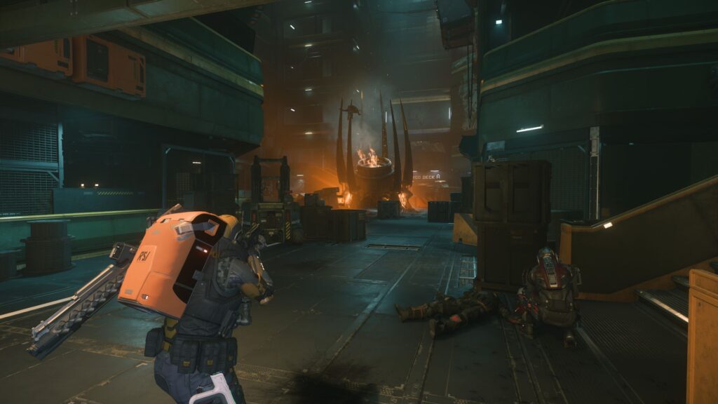 Mit gezogenen Waffen rückten wir langsam vor, sicherten uns gegenseitig. Vom Empfangsbereich zu einer breiten Treppe ins Atrium. Flackerndes Licht, Knistern, Funkenflug. Oben steckte eine brennende Vanduul-Enterkapsel im Boden. Auf einem Ausleger war ein Mensch aufgespießt. Der Einschlag musste die ganze Station erschüttert haben. Die Vorstellung, wie der Vanduul Angriff ablief, ließ mich erzittern. Wie lange war der Angriff her? Würden wir in der Station auf Vanduul treffen? Ein Kloß bildete sich in meinem Hals.
